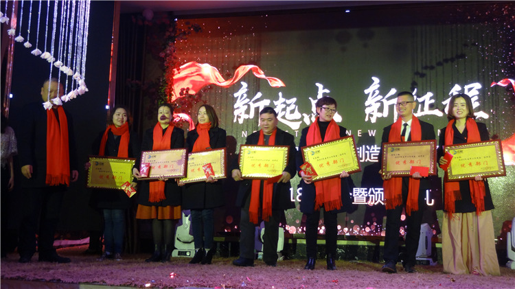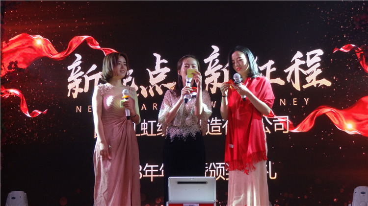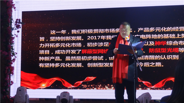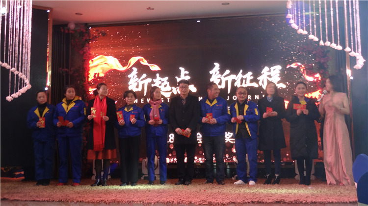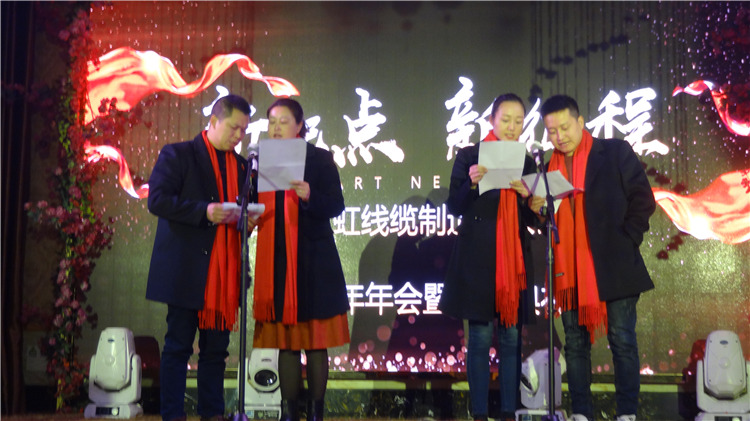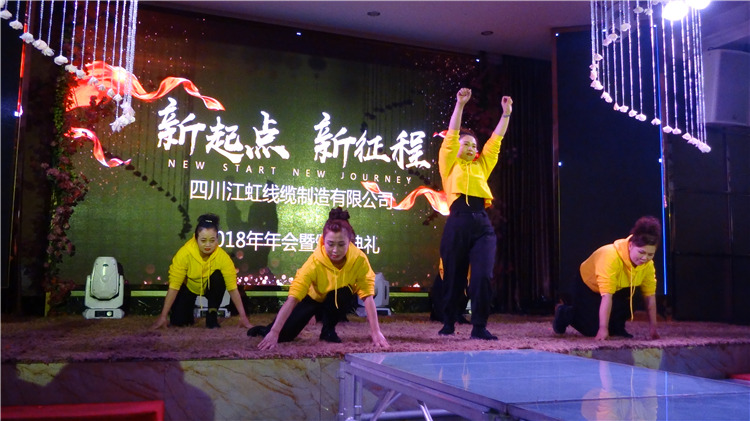 新起点,新征程。律回春渐,新元肇始。伴随着新年的钟声,我们送走丰硕的2017年,迎来充满期待的2018年。2018年2月13日下午3点30分,在江油市逸景苑休闲中心召开2018年度江虹线缆年会暨颁奖典礼。首先由公司党支部书记、执行董事、总经理李代金同志作了开场致辞。接着党支部倡议为公司员工的父母发放了孝顺金,之后又牵头慰问了公司困难员工,并且全体党员进行了《歌颂党恩,喜迎十九大》的朗诵表演。然后节目汇报表演正式拉开序幕,个人独舞、多人合舞、创意T台秀、欢乐小品、深情献唱等多种形式的表演迎来了阵阵喝彩。穿插其中的优秀表彰环节包含对公司生产标兵、先进个人、优秀管理者、优秀部门和招投标工作等,这个荣誉不是终点,而是起点。希望他们以更好的业绩来回馈公司,来年再创佳绩。多轮抽奖环节更是产生了数名幸运者,愿将这份幸运传递给更多人。本次年会暨颁奖典礼取得了圆满成功,江虹人将以更饱满的精神、更昂扬的斗志献礼公司20周年庆,2019年会我们再相聚。