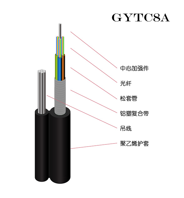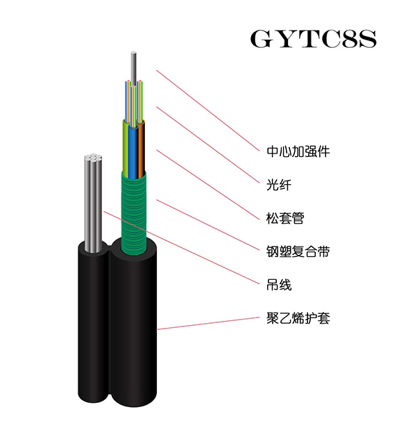 由缆芯护层单元和平行的吊线单元以及两者之间的吊带三大部分组成。光缆缆芯护层单元是全截面阻水结构,光缆的缆芯结构分为松套层绞式、中心束管式和骨架式三种。